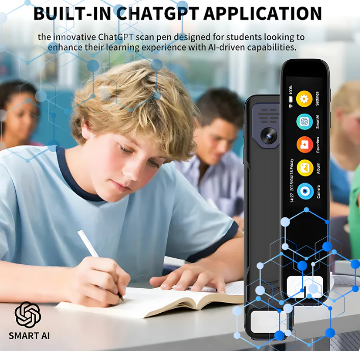 The SolveAI Scanning Pen is a smart device that instantly answers questions, translates in real time, and scans text. It has a large HD screen, Wi-Fi, offline translation for 60+ languages, a built-in camera, Bluetooth, music playback, file storage, and voice recording.